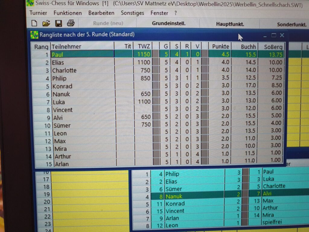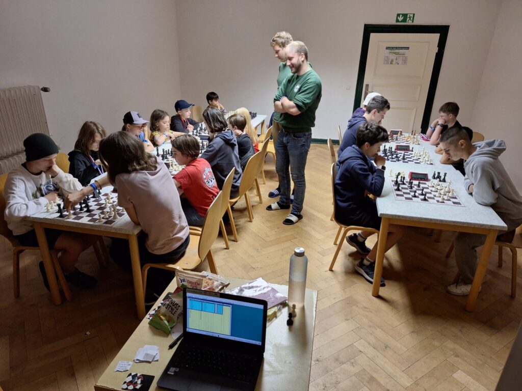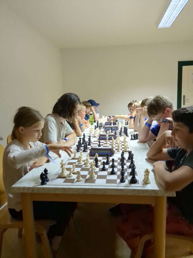 Am Nachmittag war für die Jugendlichen die 2. Runde Training angesagt und die Jüngeren spielten ein Schnellschach Turnier unter sich. Da setzte sich Paul souverän mit 4,5/5 durch und belegte den ersten Platz, dicht gefolgt von Elias (2. Platz) und Charlotte (3. Platz), beide 4/5 Punkte, aber Elias die leicht bessere Buchholz-Wertung.