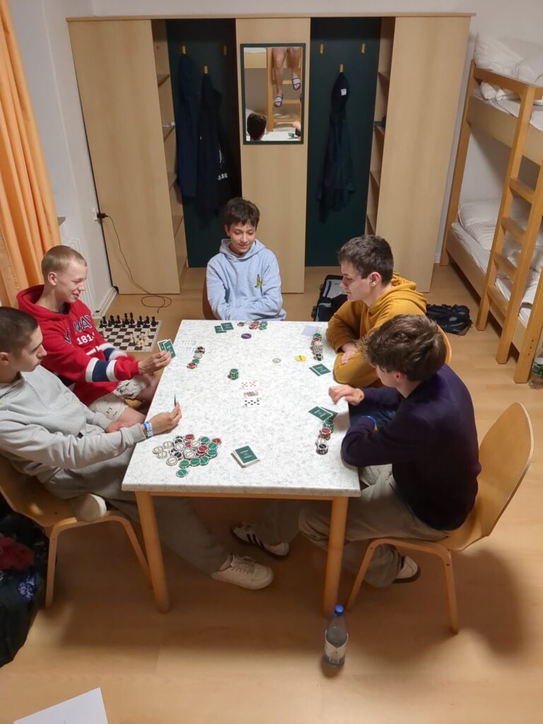 Wir Jugendlichen und Tim (halb Trainer, halb Trainierter auf dieser Fahrt) spielten am ersten Abend noch die erste Runde des Langzeit-Turniers, das unsere Woche prägte, da wir diese Partien immer gemeinsam analysierten, um daraus möglichst viel zu lernen. Danach gingen wir aber recht früh schlafen, um fit für den darauffolgenden und intensiven Trainingstag zu sein.